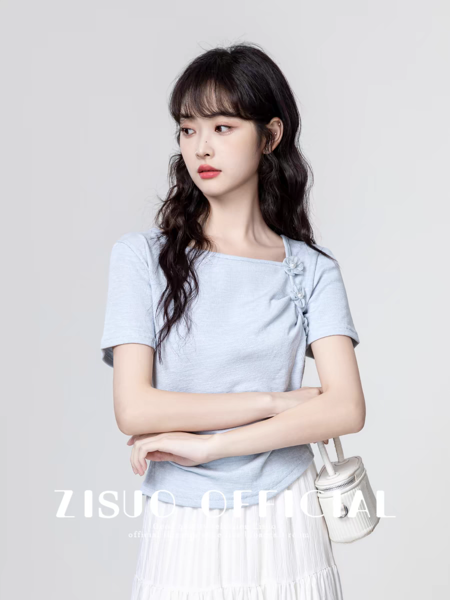 蓝色不规则短袖T恤女2024夏季新款温柔风立体花朵正肩体恤短上衣