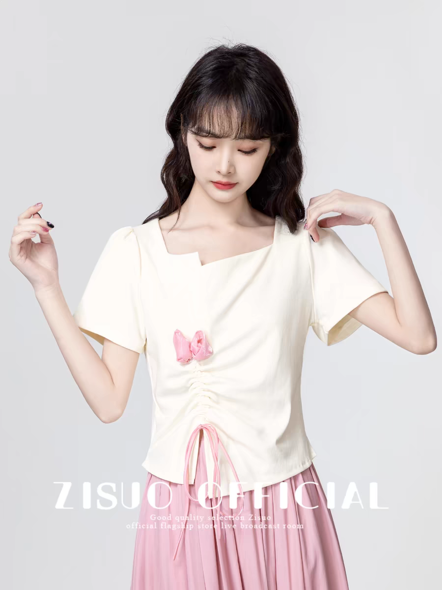 不规则方领短袖T恤女2024夏季新款抽绳设计感显瘦正肩体恤短上衣