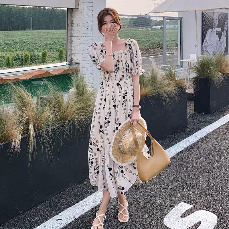温柔风仙气复古泡泡袖碎花连衣裙女短袖长裙