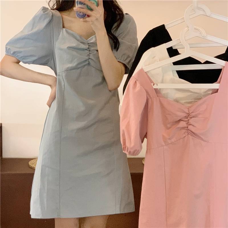 夏季2021新款法式复古气质小裙子收腰显瘦方领黑色泡泡袖连衣裙女