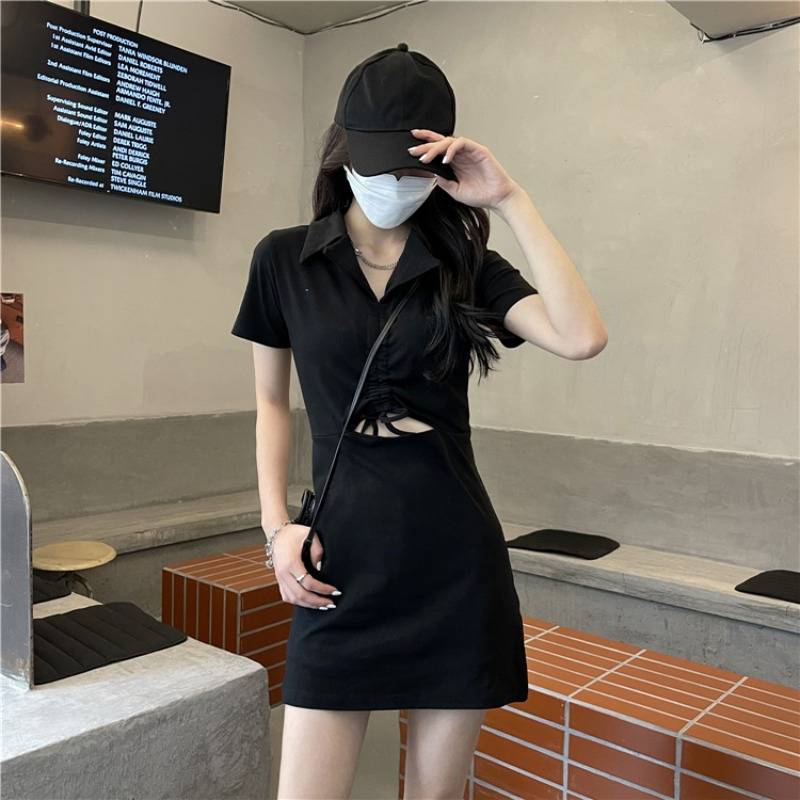 樱田川岛2021夏季新款设计感抽绳Polo领暗黑镂空辣妹显瘦连衣裙女