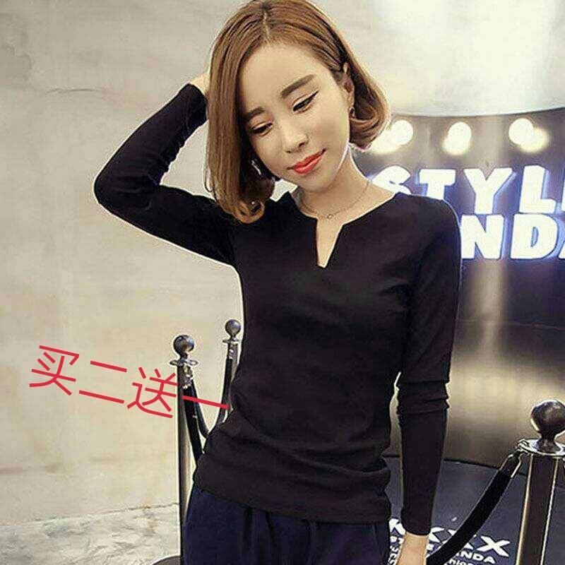 休闲小V领长袖t恤女装2019新款韩版内搭上衣服紧身薄款打底衫春秋