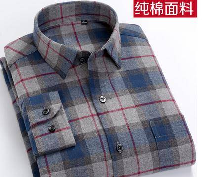 秋冬款磨毛格子纯棉男士长袖衬衫全棉休闲中老年爸爸装加大码衬衣