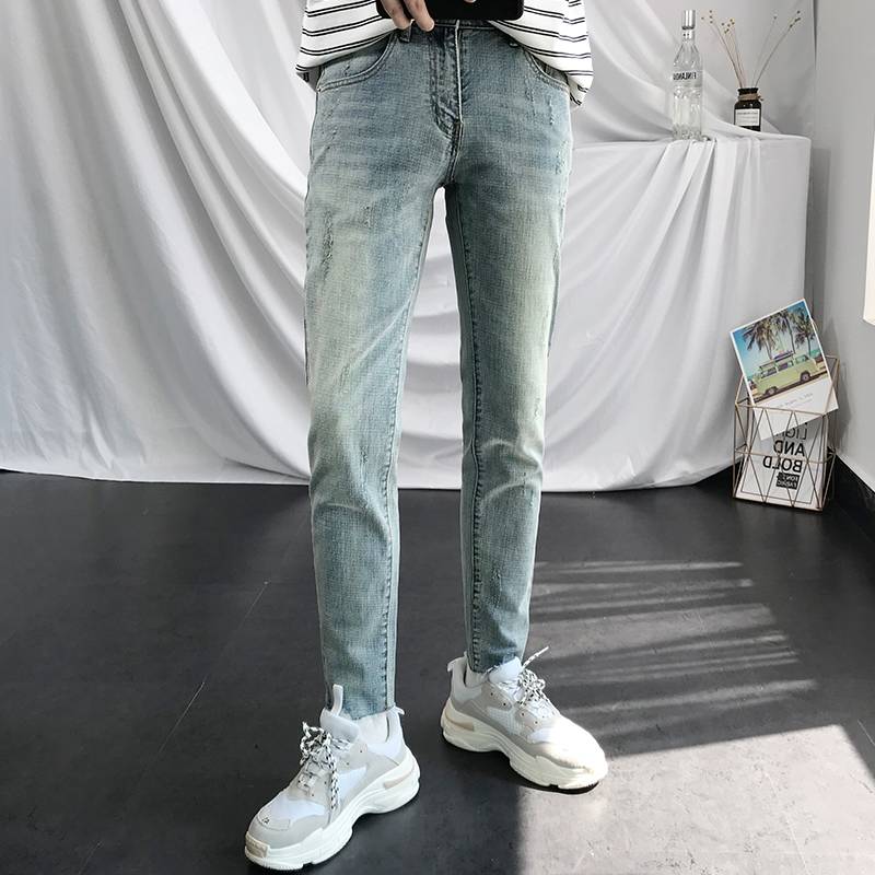 男装秋新款浅色做旧韩版修身牛仔裤磨边小脚九分裤子学生潮