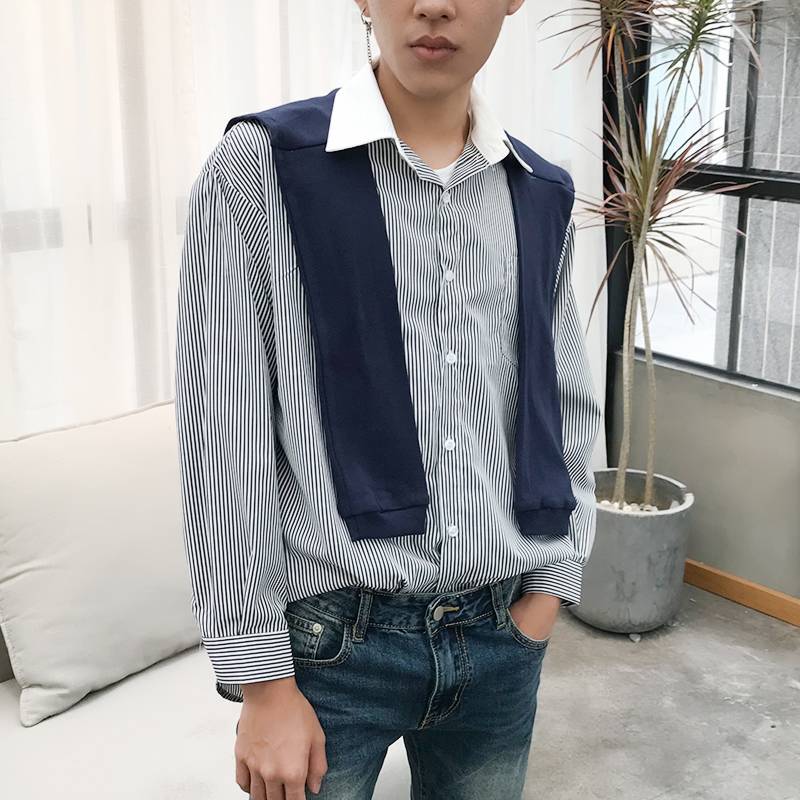 男装针织小披肩条纹长袖宽松衬衣秋季韩风ins风新款披肩衬衫