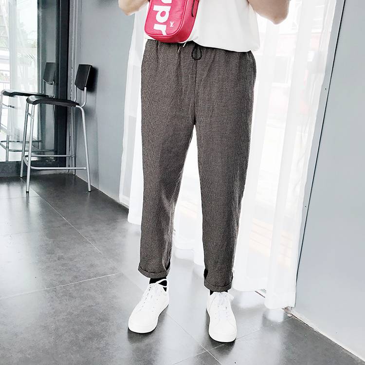 日系原宿千鸟格棉麻宽松九分裤 无几男装 港风阔腿休闲9分裤 潮