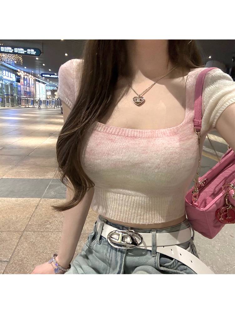 2023多巴胺少女/方领渐变短袖t恤女设计感小众修身短款辣妹上衣