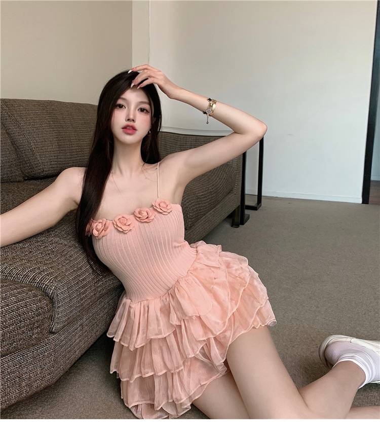 2023辣妹性感露肩粉色连衣裙设计感花朵吊带收腰显瘦层层蛋糕裙潮