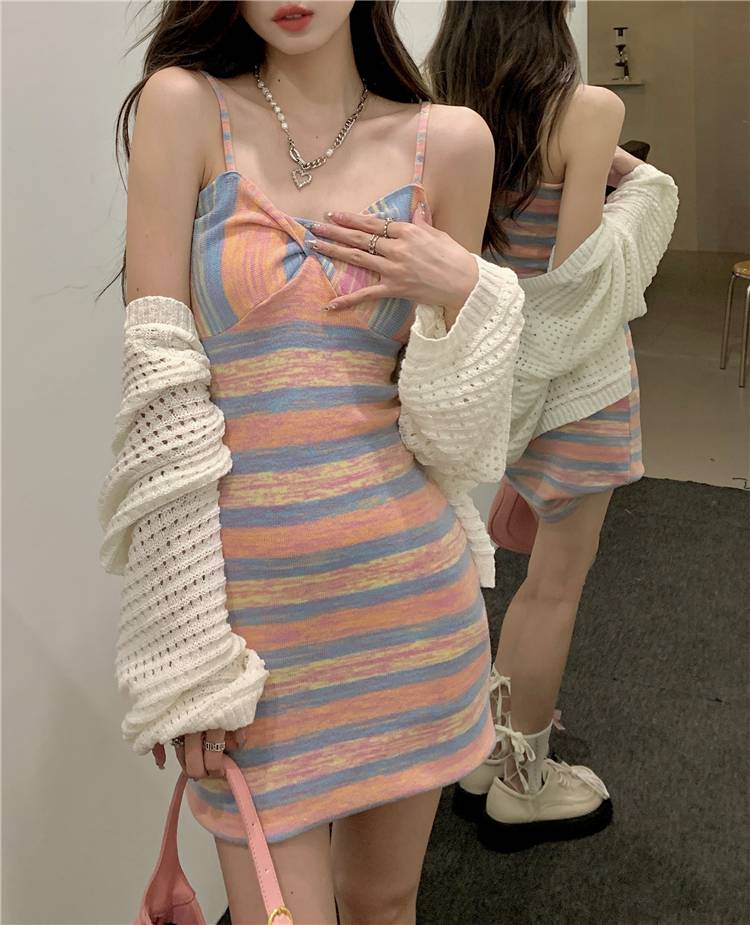 纯欲甜心撞色条纹针织吊带连衣裙女春季2023新款收腰显瘦辣妹短裙