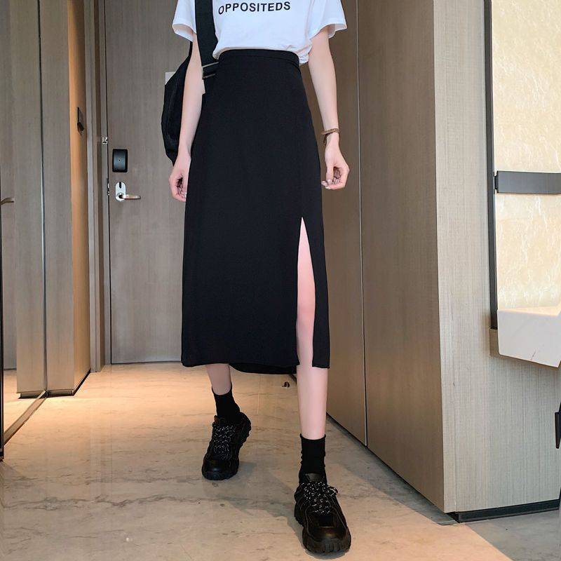 2023夏季新款大码胖mm高腰中长款黑色开叉半身裙女A字包臀裙