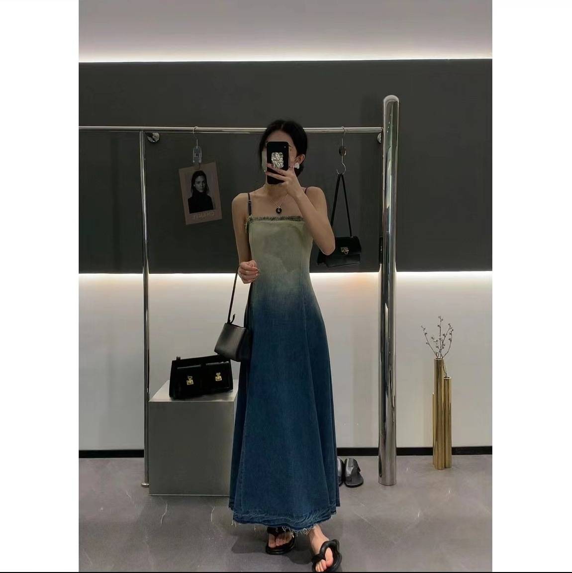 2023新款渐变设计水洗牛仔吊带连衣裙设计长裙女法式
