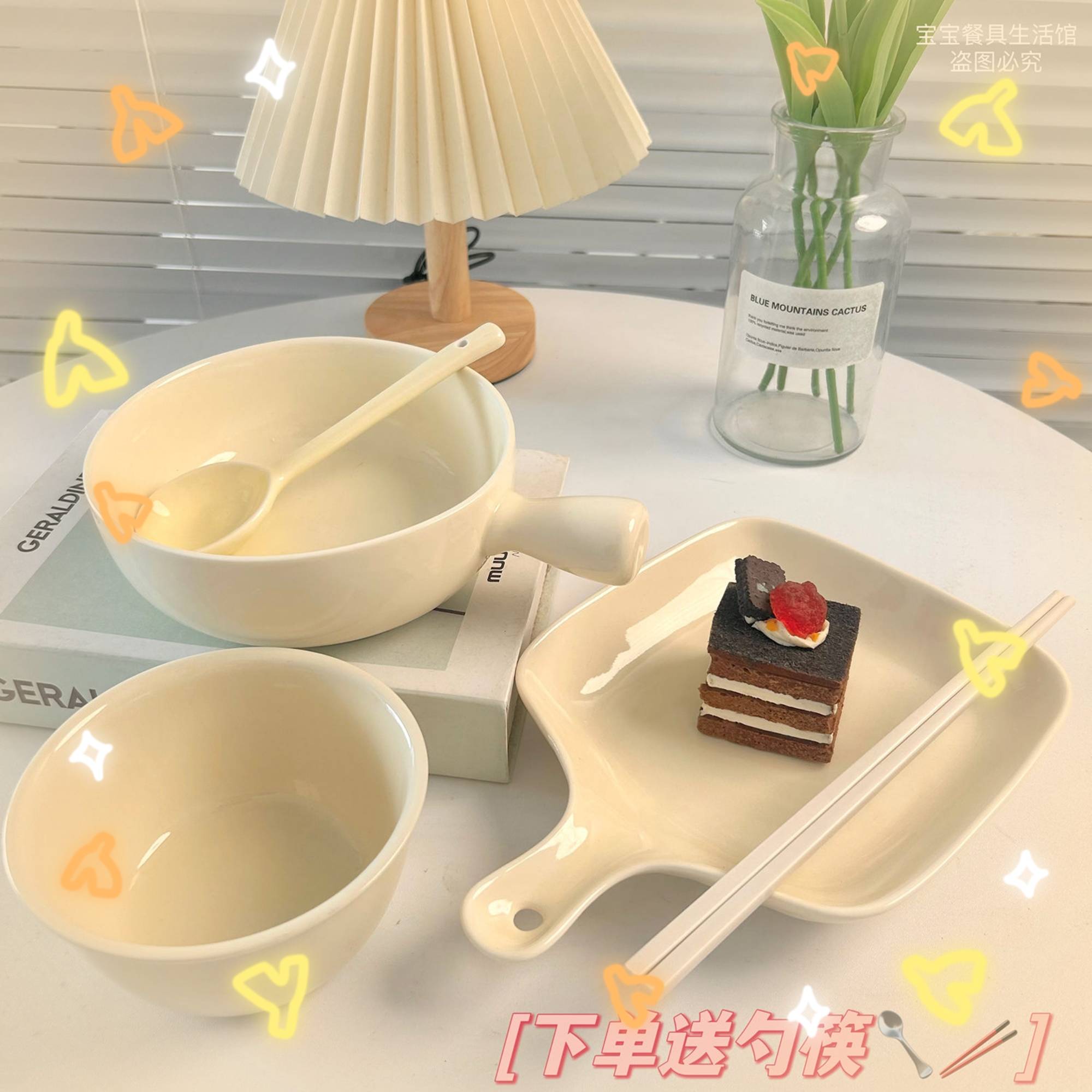 奶fufu陶瓷碗手把碗勺少女心一人食釉下彩焗饭碗奶油色系餐具套装