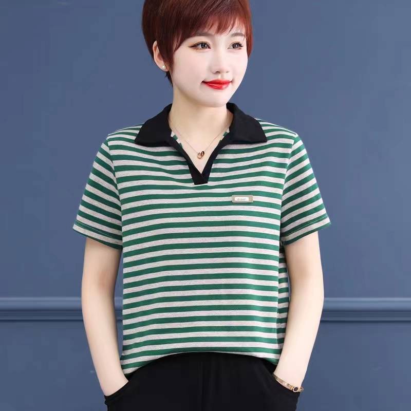 翻领短袖上衣女2023夏季新款条纹中年妈妈遮肚子洋气V领正肩t恤女