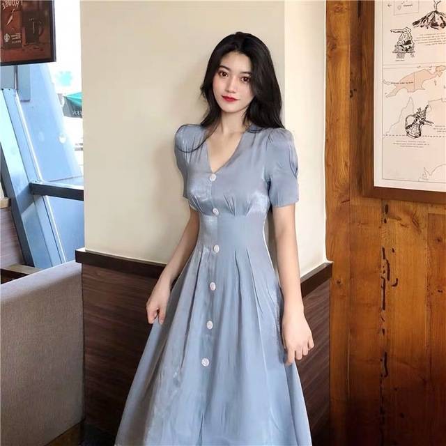 法国小众桔梗裙子女2020夏装新款气质V领单排扣雪纺短袖连衣裙女