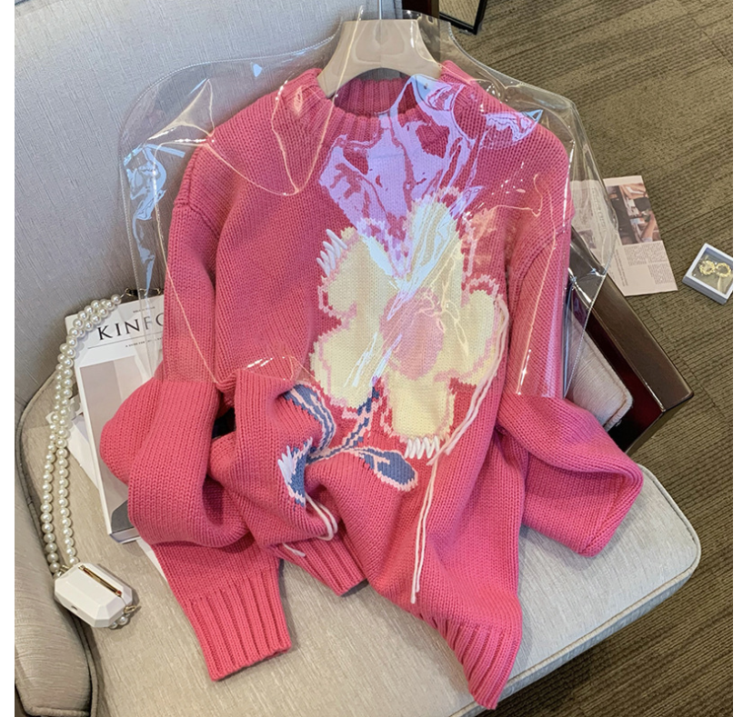 小众设计感潮牌花朵毛衣女2021中长新款春秋外穿宽松韩版慵懒显瘦