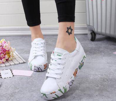 人本春季新款超纤皮面纯色低帮系带帆布鞋女花卉涂鸦休闲学生女鞋