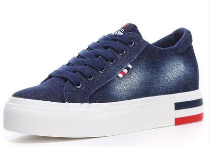 人本春季新款低帮系带帆布鞋女平底内增高休闲帆布学生鞋蓝色牛仔