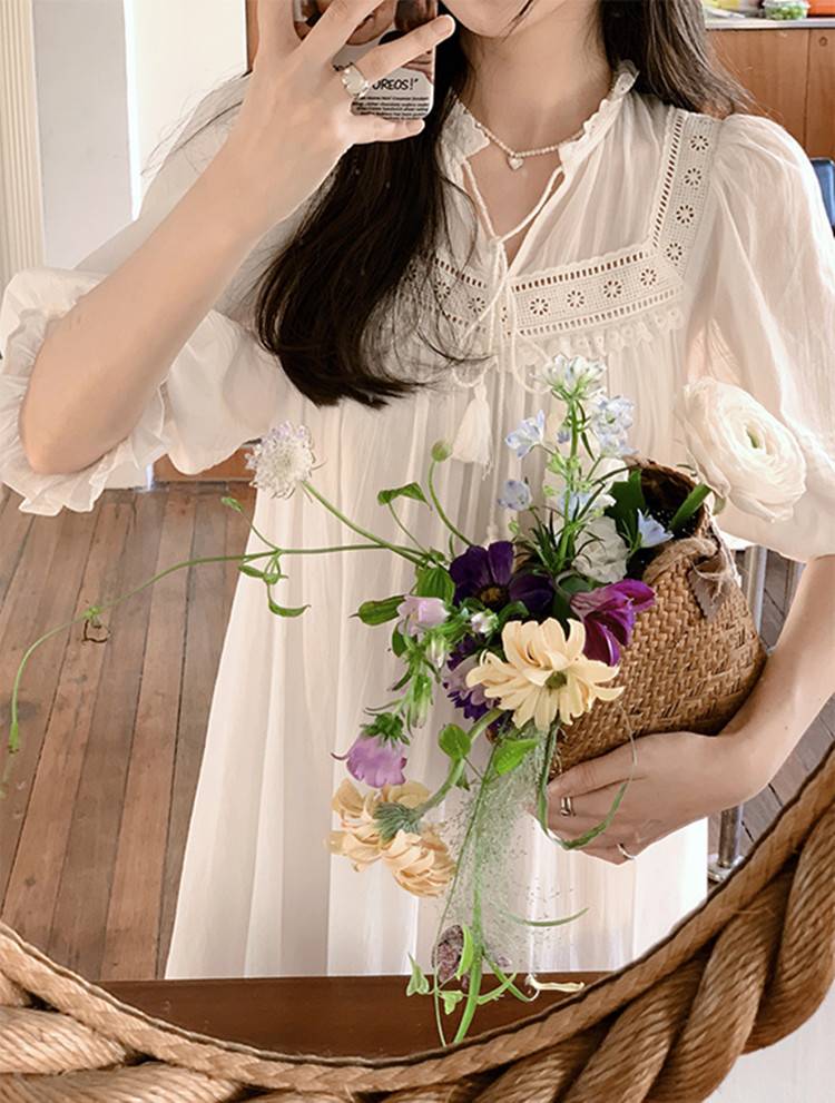 英伦LPXONA在逃公主连衣裙法式蕾丝镂空设计感泡泡袖气质度长裙女