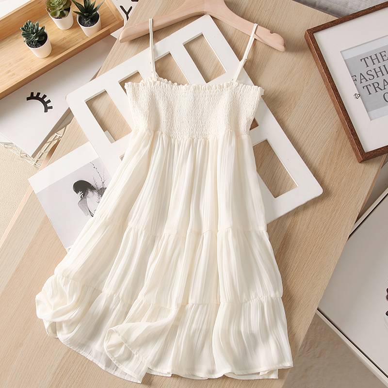 法式一字领白色薄纱短吊带连衣裙女夏小个子气质叠层荷叶边短裙子