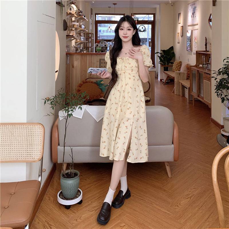 大码胖mm夏季新款女法式方领系带淑女裙碎花开衩设计感连衣裙遮肚