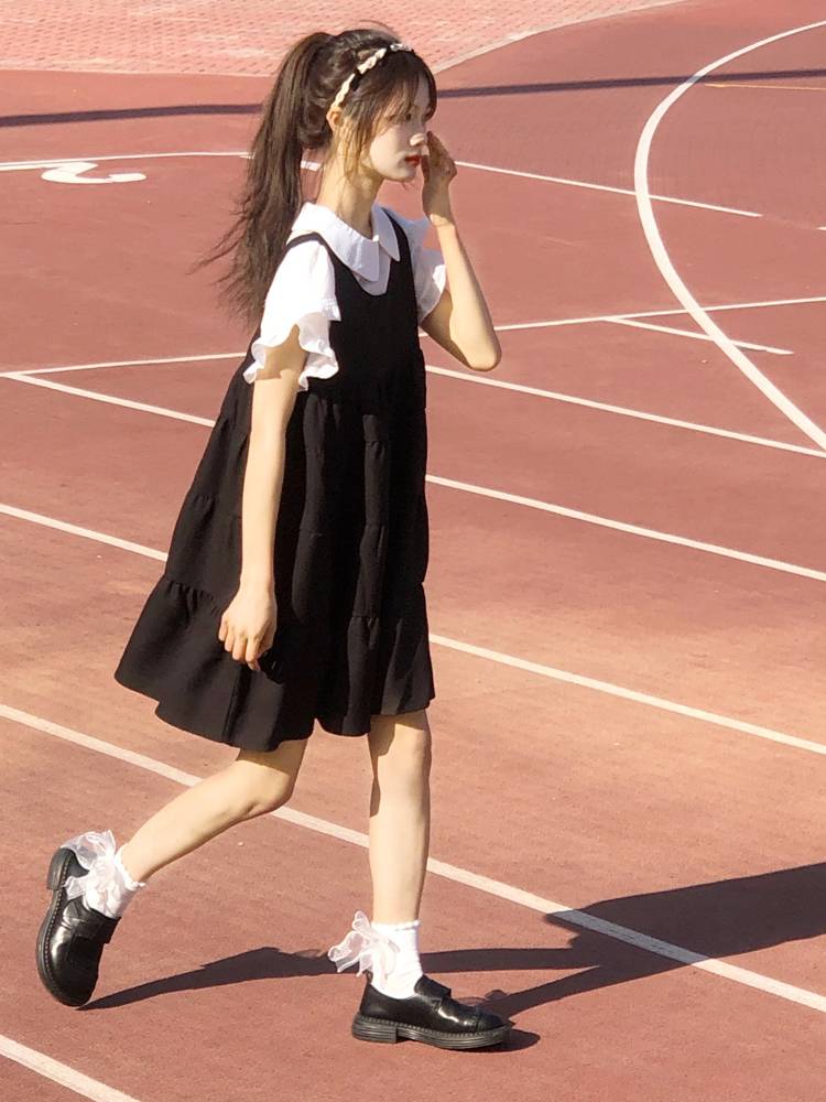 娃娃领衬衫黑色连衣裙小众设计2023新款女甜美学院风套装裙春夏