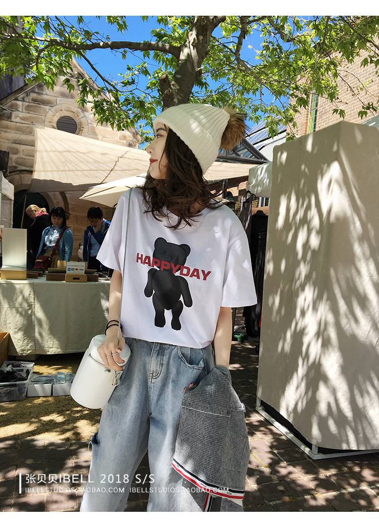张贝贝ibell2018新款秋季小熊图案T恤纯棉宽松短袖女装字母上衣