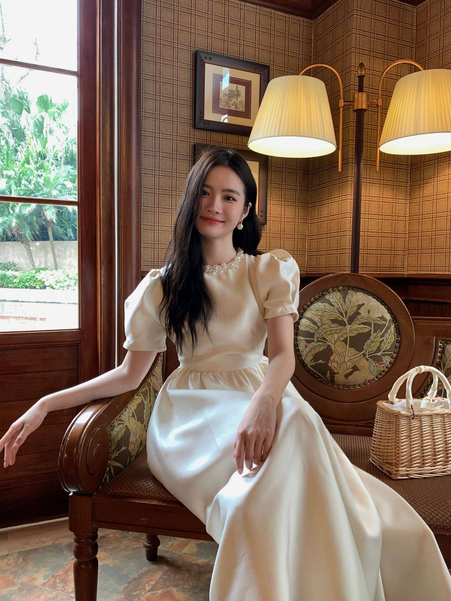 2023新款纯色连衣裙女2023夏韩系泡泡袖圆领收腰长裙