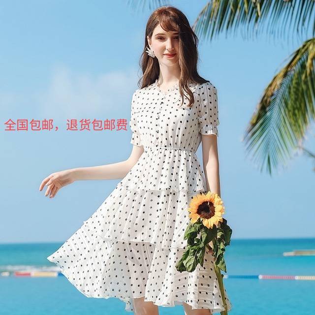 2021夏季新款女装v领波点荷叶边裙气质雪纺连衣裙全国包邮