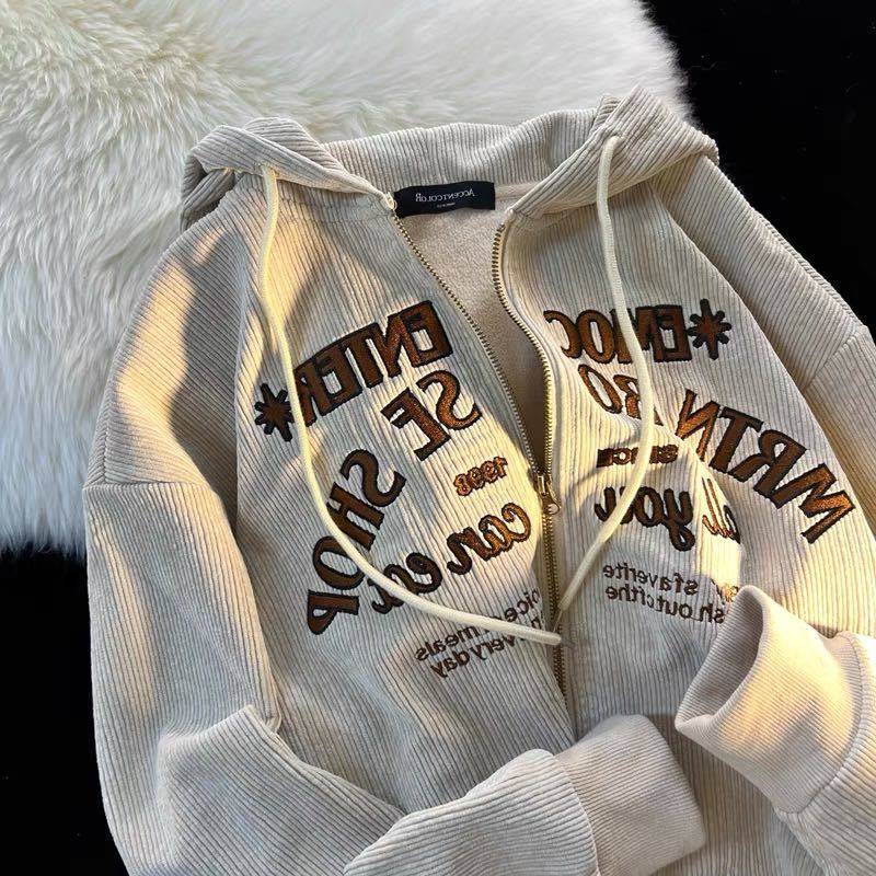 OLUX美式复古字母刺绣灯芯绒外套女秋冬加绒加厚宽松vibe风开衫潮