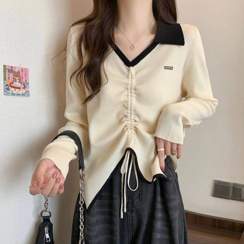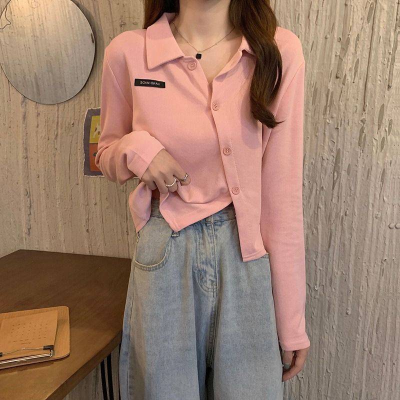 100%纯棉显瘦设计感开叉百搭长袖初秋女不规则短款别致Polo领上衣