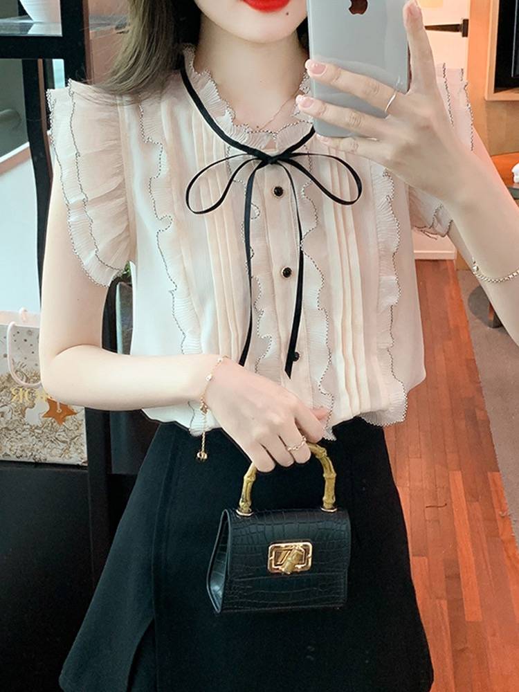 法国小众桔梗裙子女2025夏装新款气质V领单排扣雪纺短袖连衣裙女
