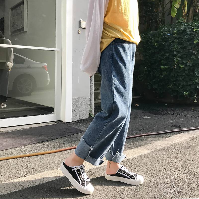 那子2018秋季新款韩版女装胖mm大码宽松不规则裤口破边九分牛仔裤
