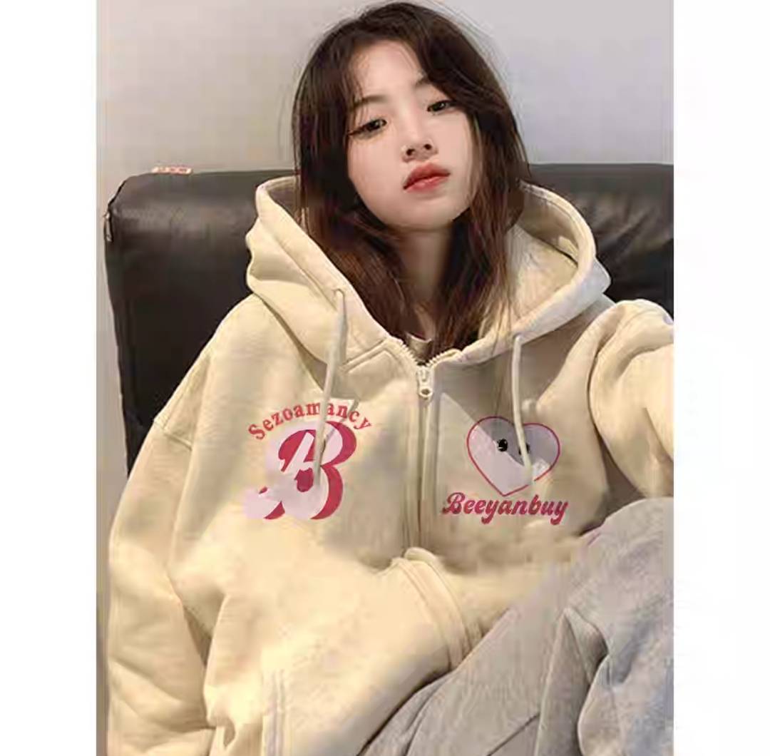 奶杏色连帽宽松oversize开衫加绒卫衣外套女春秋薄款2023新款帽衫