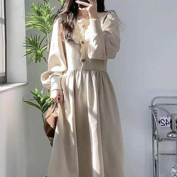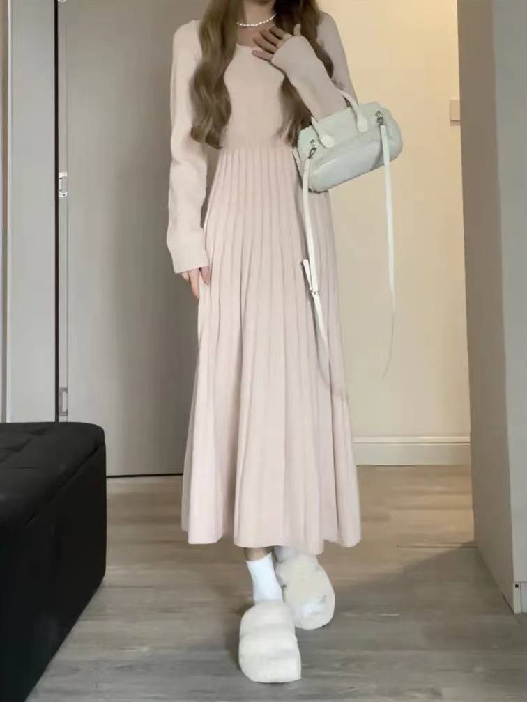 【松本丧丧】收腰竖条条纹温柔风针织长袖小方领连衣裙