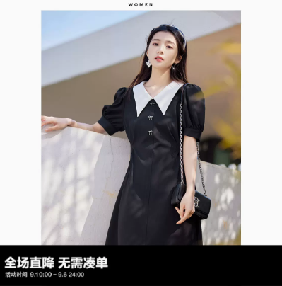 太平鸟黑色法式连衣裙夏季新款蝴蝶结收腰撞色翻领气质小黑裙