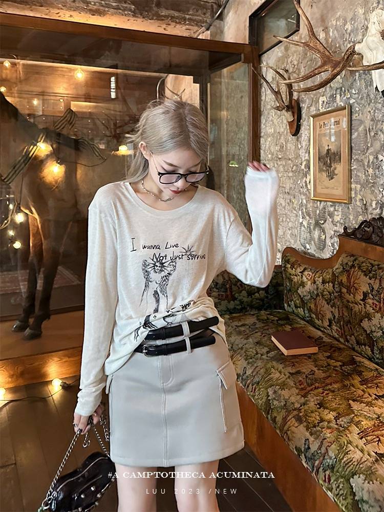 ohhweme/两色印花长袖t恤防晒夏季薄款小众设计感宽松女