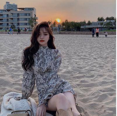 林珊珊秋冬长袖碎花裙抽褶荷叶边连衣裙女收腰显瘦气质轻熟风裙子