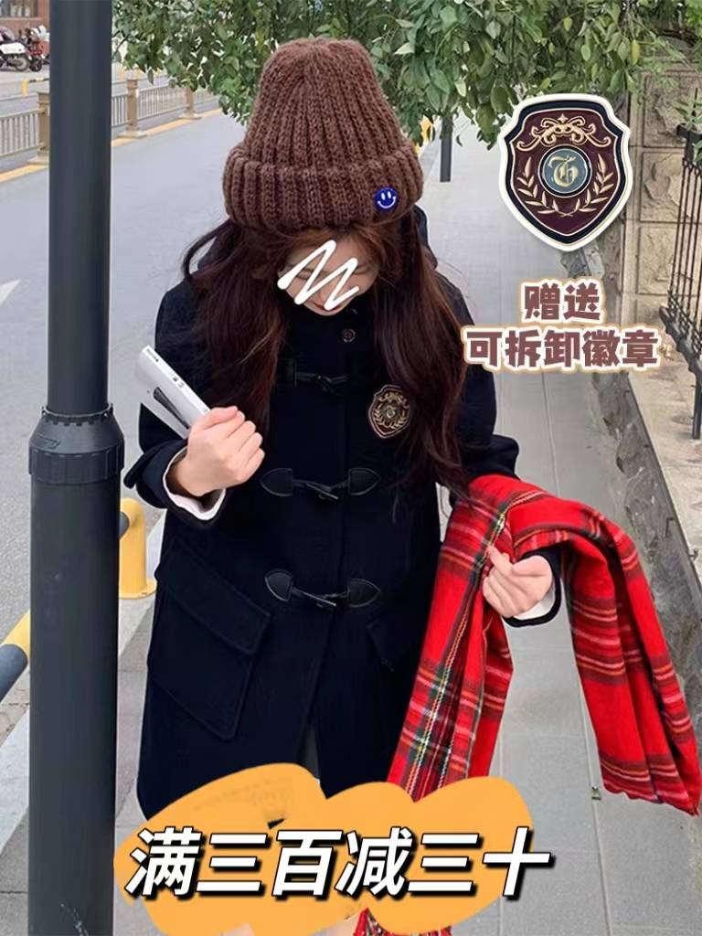 原创连帽双面尼女大衣外套秋冬牛角扣小个子jk毛呢