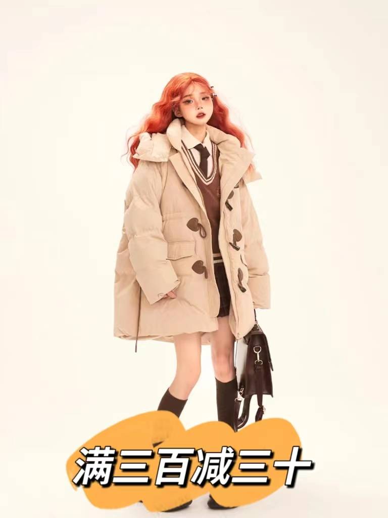 白鸭绒羽绒服女2023新款粉色加厚甜美少女牛角扣外套冬