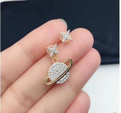 耳钉金黄色纯银镶晶钻星球不对称耳环气质女