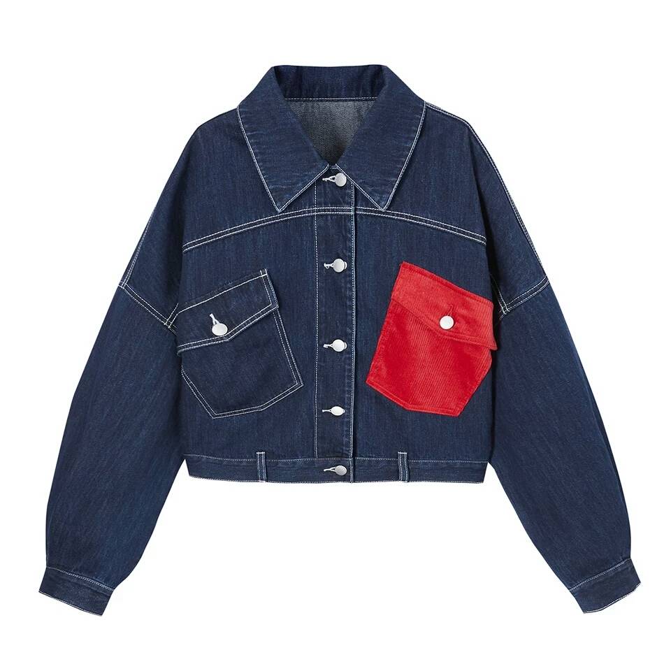 敦哥潮品女装2018春秋新款BF风纯色直筒宽松廓形拼接牛仔短款外套