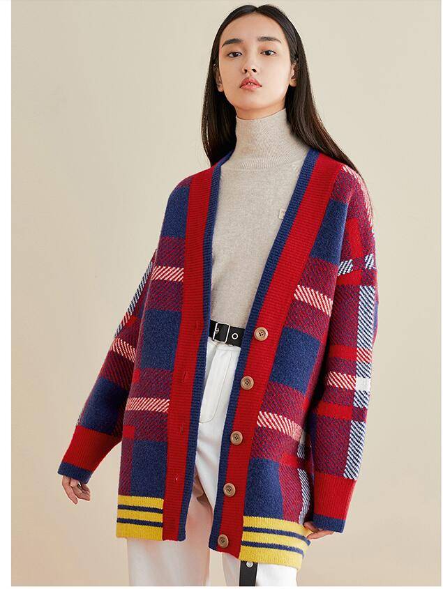 红色格纹慵懒风针织开衫外套女2018秋冬新款撞色中长款毛衣