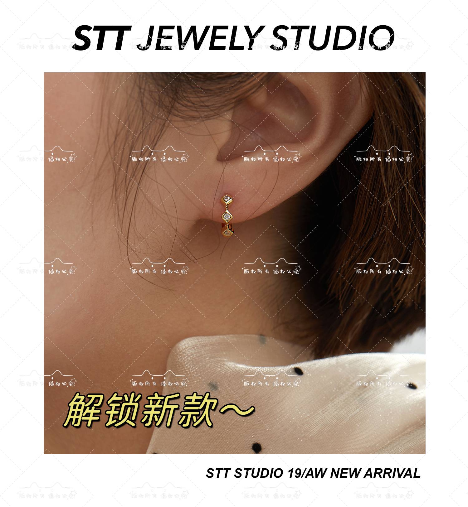 沈太太S925纯银个性耳圈菱形耳扣女复古港风时尚设计白领气质耳饰