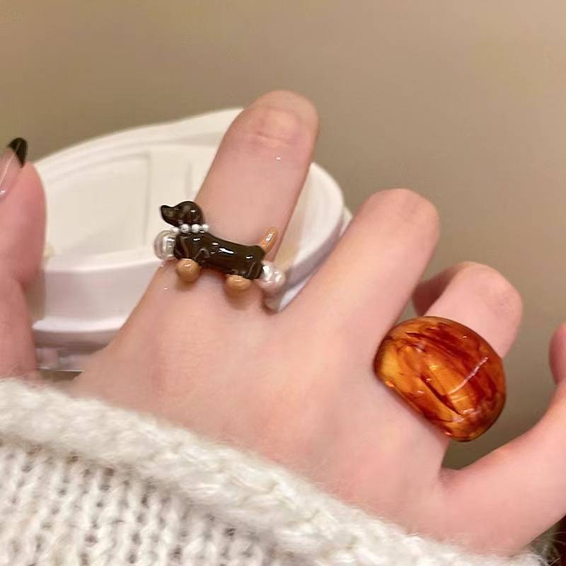 咖色腊肠狗珍珠戒指女戒秋冬可爱美拉德戒指