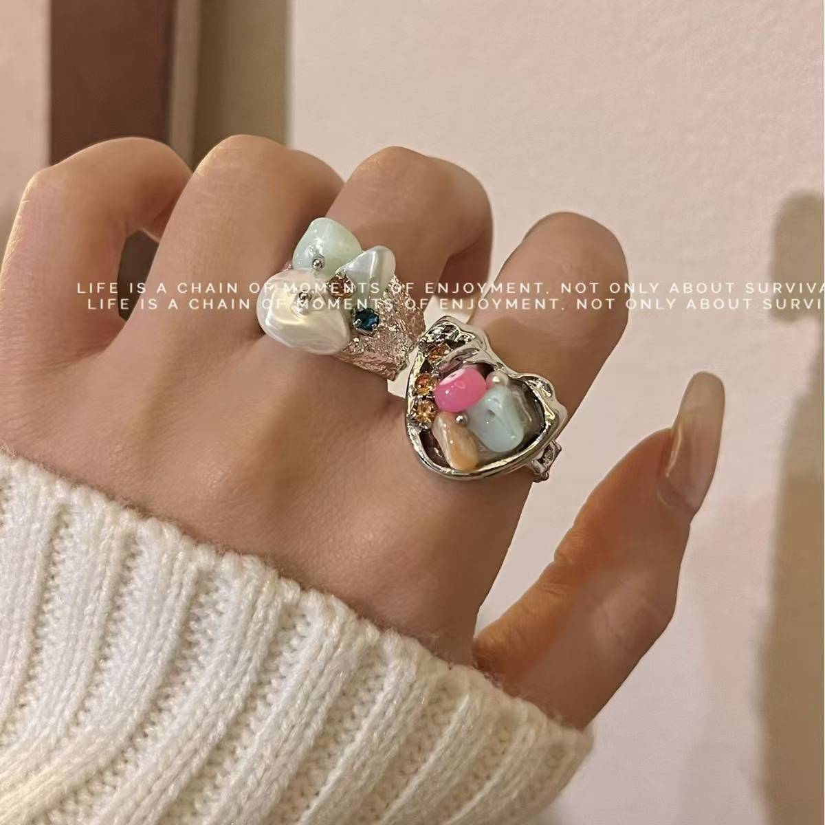国潮手工天然串珠金属感彩色珍珠戒指开口式