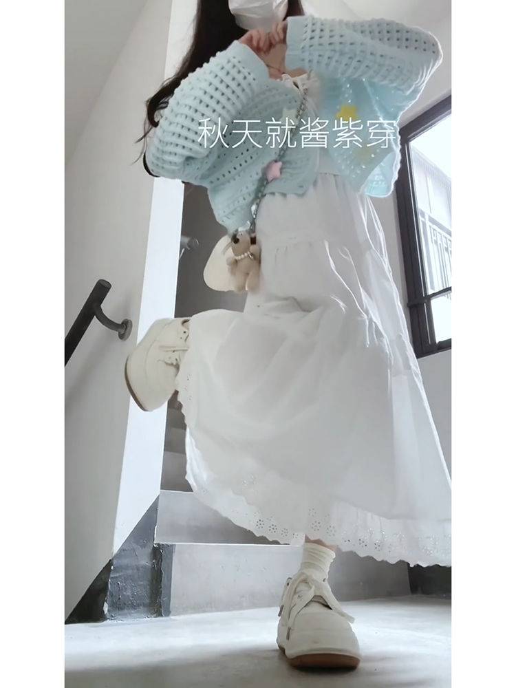 奶呼呼穿搭早秋季甜美镂空针织开衫白色半身裙吊带小个子三件套装