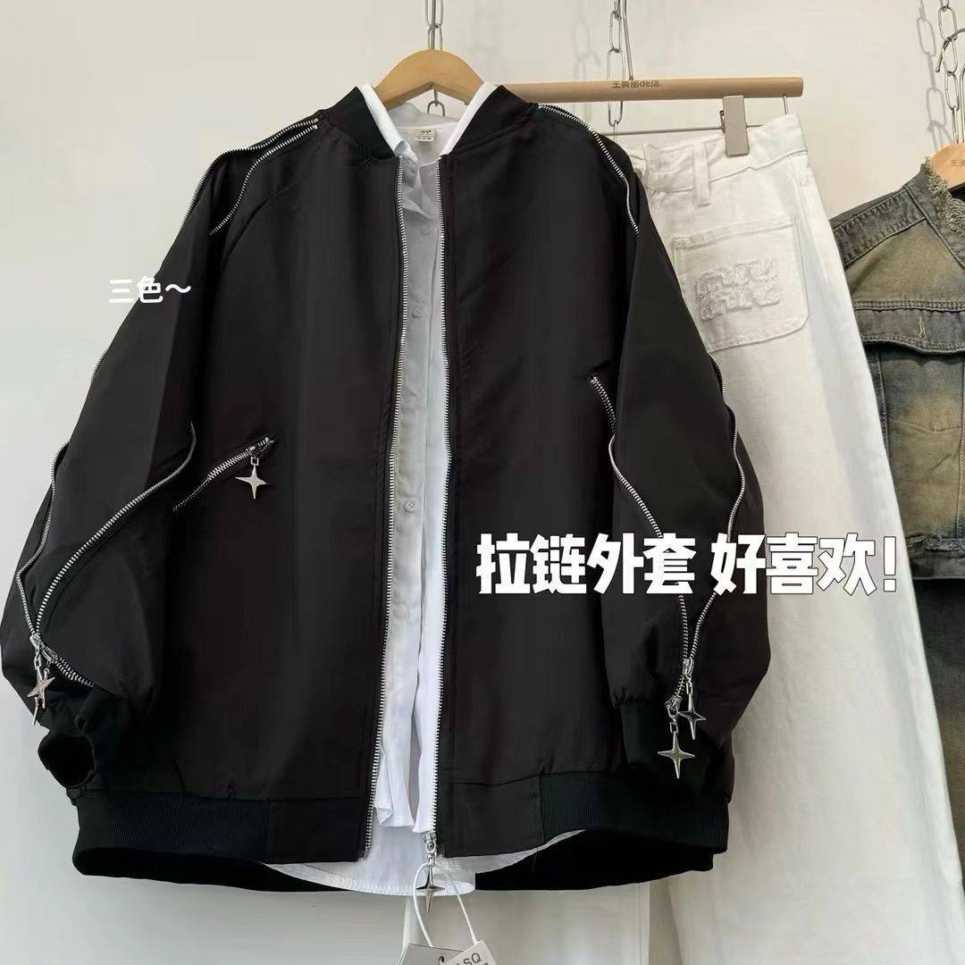 甜酷风不规则拉链外套女春季潮牌宽松休闲情侣立领飞行员嘻哈夹克