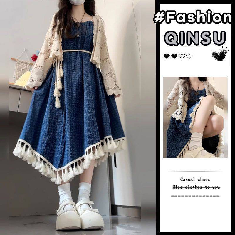 秦宿2024秋季新款复古学院风流苏宽松吊带连衣裙女生开衫两件套装