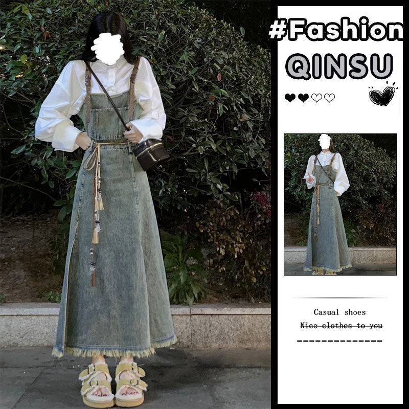秦宿牛仔背带裙女秋季新款水洗毛边复古高腰显瘦吊带中长款连衣裙