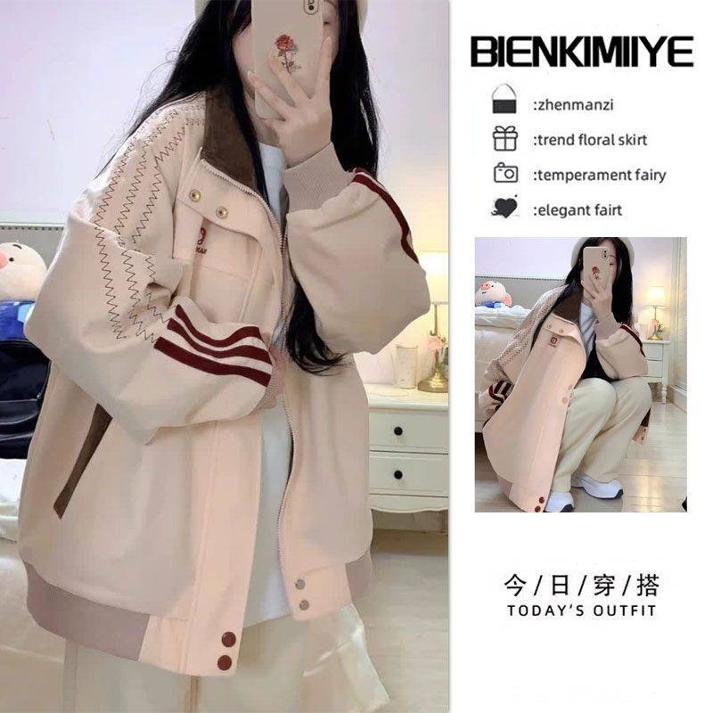 BIENKIMIIYE2024秋冬新款学院风撞色条纹翻领拼接外套女百搭夹克